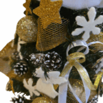 Dekorácia je bohato zdobená bielymi hviezdami, trblietavými zlatými guľami, jemnou zlatou sieťkou, snehovými vločkami a prírodnými šiškami so zasneženým efektom. Najdominantnejším prvkom je biela mikulášska čiapka so zavinutou šnúrkou a hviezdou na konci, ktorá stromčeku dodáva hravý a jedinečný vzhľad.